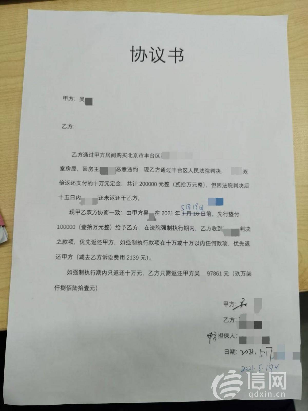 吴先生觉得很委屈,在他看来,整个交易过程中自己尽职尽责,没有失误,是卖家毁约且转移资产导致买家收不到定金。公司为了平息客户的投诉,把责任都推给了基层员工。但为了能继续在链家工作,吴先生只能忍气吞声,接受公司的决定。他说:“一边是公司施加的压力,一边是买家没拿到赔偿不断投诉,到了2021年的5月,我和商圈经理实在没办法,只能各自掏了5万元,凑齐10万元垫付给了买家。同时,我们与买家签订了协议,约定了法院的强制执行如果能拿回钱,钱优先返还给我们。”